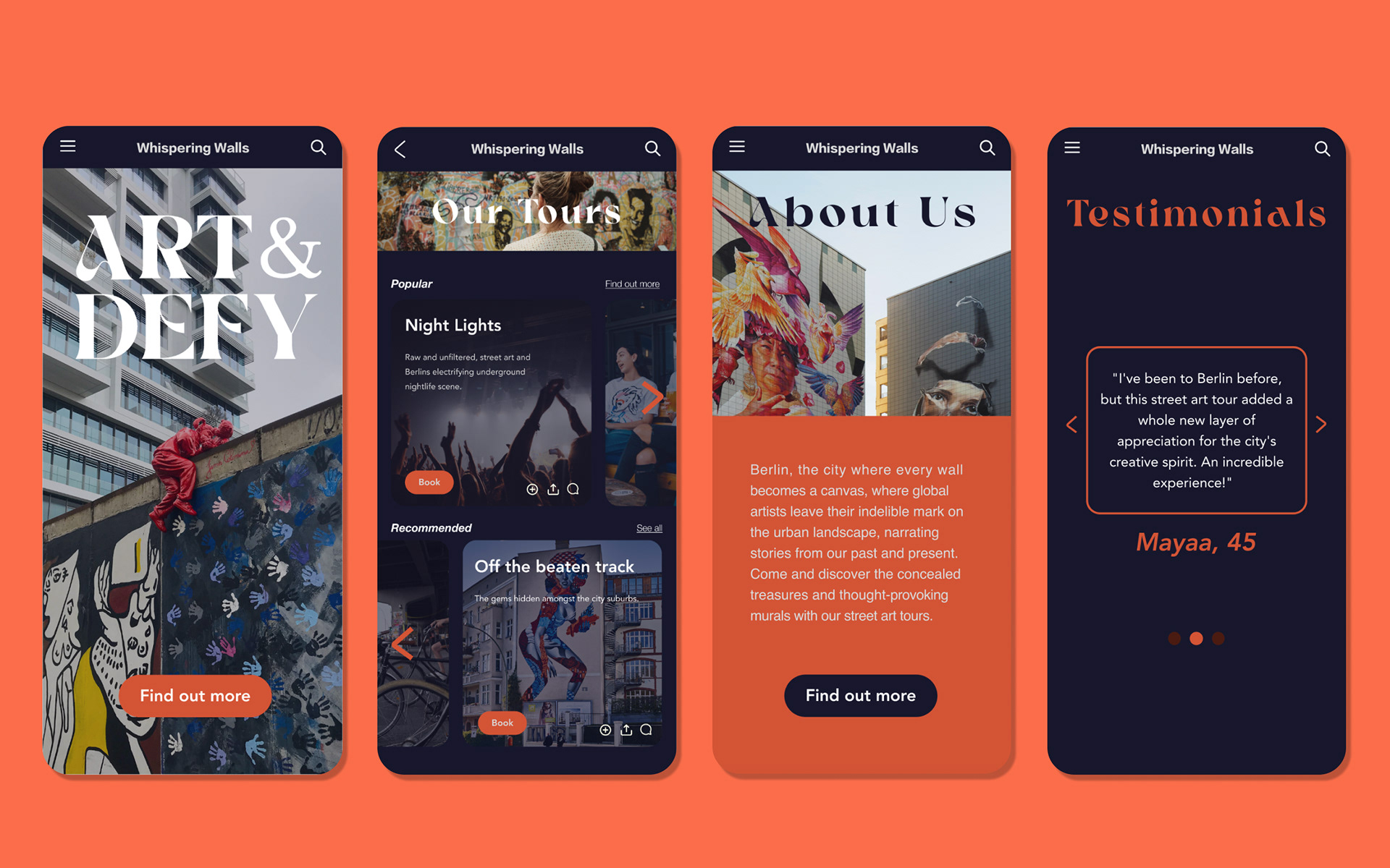 UI/UX design for Berlin street art tours. The concept is inspired by Berlin’s vibrant street art scene while also paying homage to it’s history and culture.